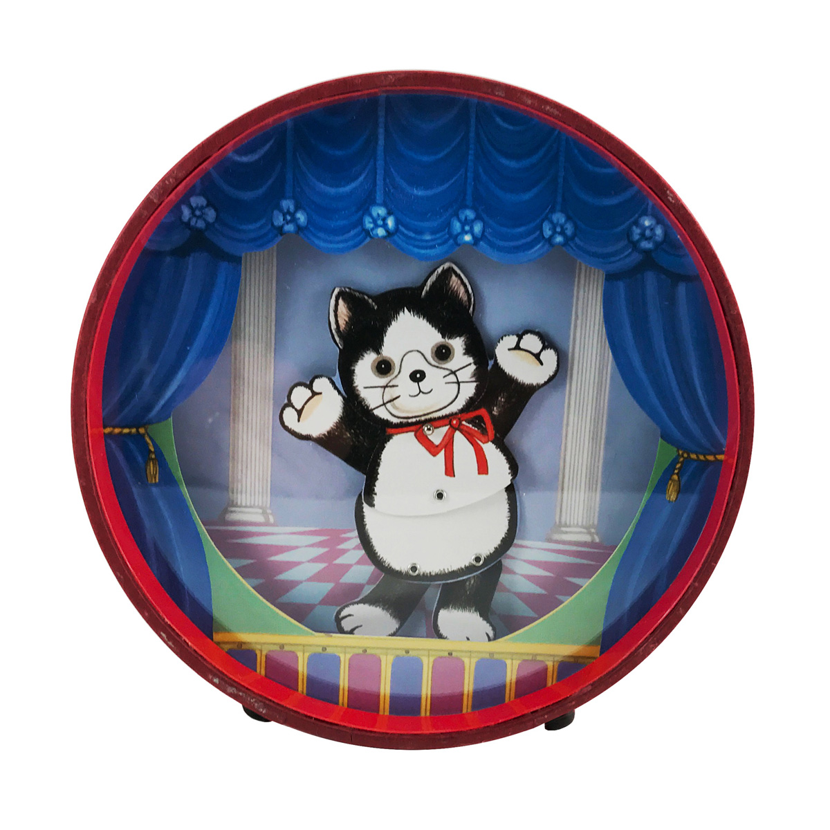 Deliziosa figura con 6 gattini nella cesta dei giochi. Carillon a carica. Movimento: gattino bianco esce dalla cesta e ombrello gira. Melodia: “My Favorite Things”. Materiale: Resina.