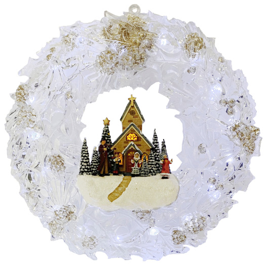 Angelo trasparente con tromba, sembra scolpito nel ghiaccio, all’interno della gonna un Villaggio Invernale in miniatura illuminato. Funziona con batterie o trasformatore non inclusi.