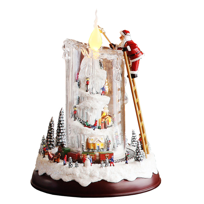 Villaggio Natalizio all’interno di una candela che viene accesa da Babbo Natale. Scena con luci, movimento e musica. Funziona con batterie o trasformatore non inclusi.