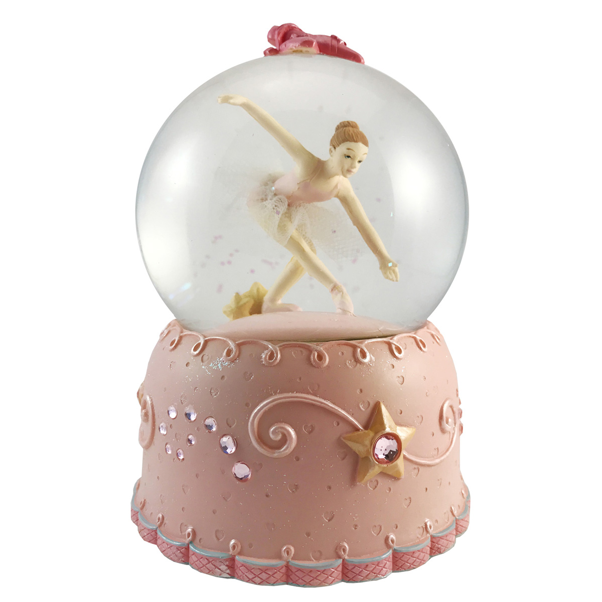 Waterglobes musicale con ballerina. Sulla sfera un paio di scarpette rosa. Base con decori a rilievo e pietre. Carillon a carica. Movimento: la ballerina gira. Materiale: Resina e Vetro.