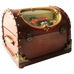 Baule dei giochi in stile vintage, con all’interno un villaggio Natalizio. Scena con musica, luci e movimento. Funziona con batterie non incluse.