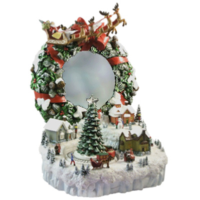 Babbo Natale su slitta trainata dalle renne sorvola villaggio Natalizio. All’accenzione magicamente il Polo Nord appare sullo sfondo. Scena con musica, luci e movimento. Funziona con batterie o trasformatore non inclusi.