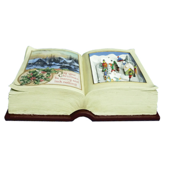 Libro aperto con all’interno una miniatura di un villaggio Natalizio. Scena con musica, luci e movimento. Funziona con batterie non incluse.